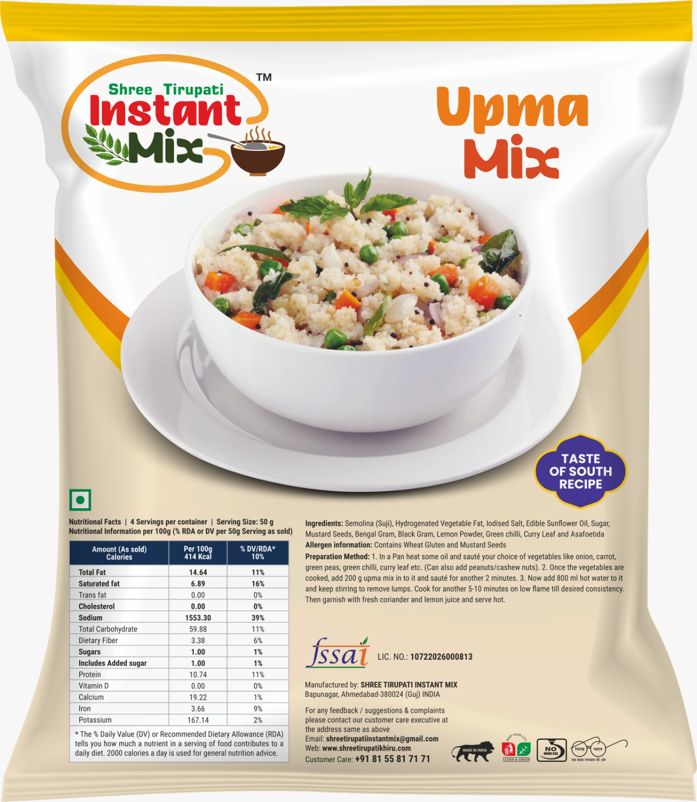 Enjoy a quick, delicious, and wholesome South Indian breakfast with our Upma Mix. Made from premium roasted semolina and a flavorful blend of spices and vegetables, it delivers a soft, aromatic, and satisfying upma in minutes. Ideal for busy mornings, snacks, and light meals.